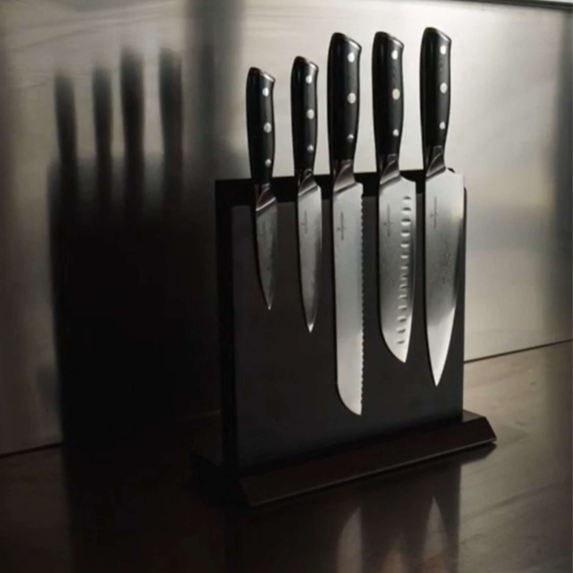 Set Includes: 3.5" Paring Knife, 5" Utility Knife, 7" Santoku Knife, 8" Chef's Knife, 8' Serrated Bread Knife, Honing Rod, and Magnetic Knife Stand
