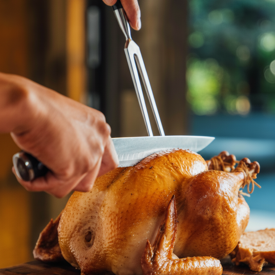 The carving knife slices thin, precise cuts of meat with its long, narrow blade, ensuring smooth strokes. The carving fork provides stability when slicing.