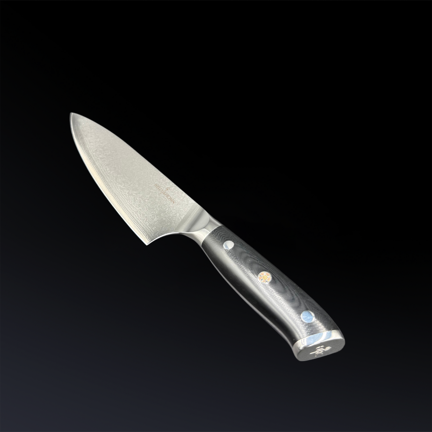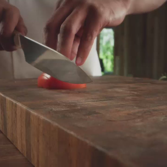 The chef's knife is a must-have in any kitchen, perfect for chopping, slicing, dicing, and mincing. Its broad, sharp blade ensures precision and efficiency for preparing vegetables, meats, and herbs.