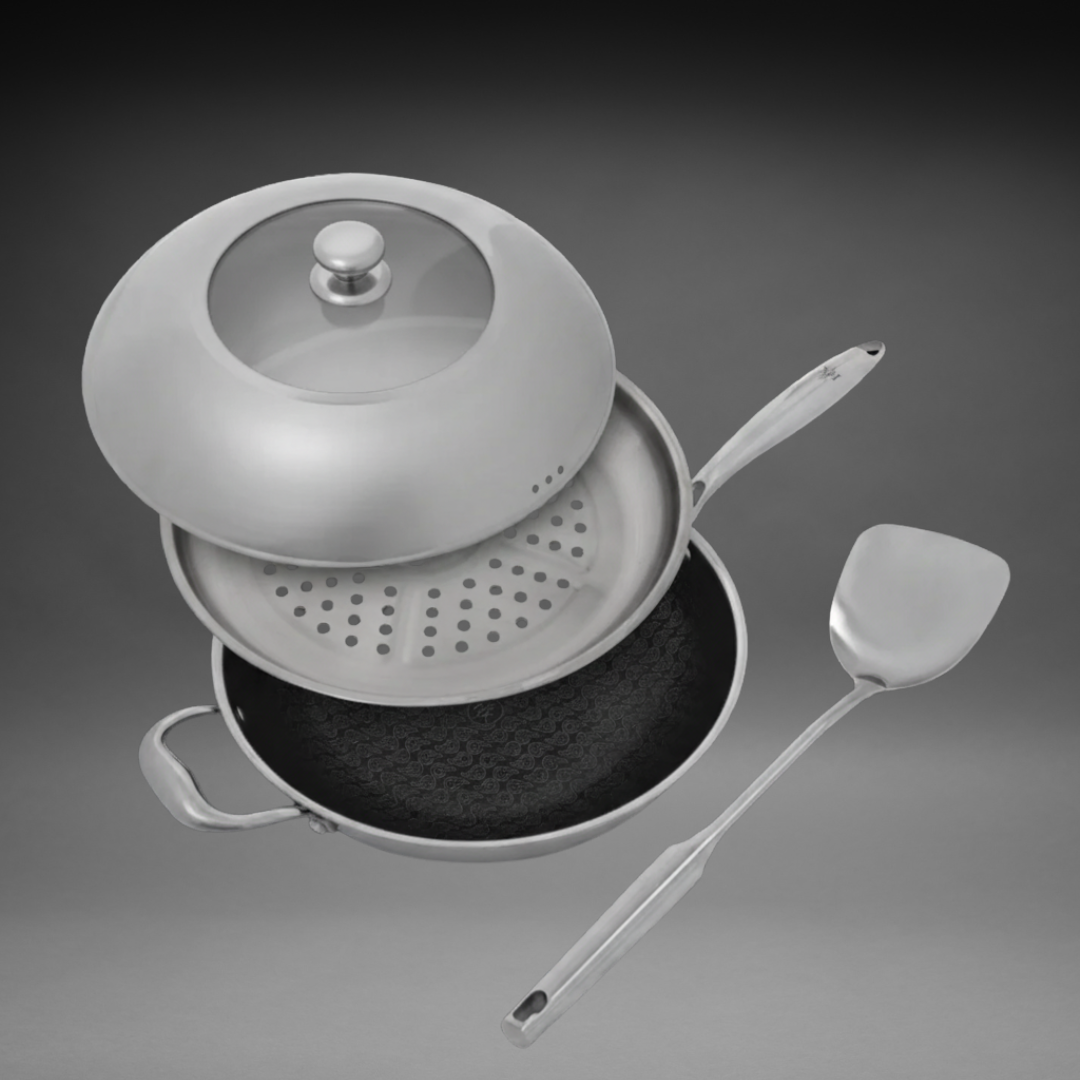 Includes: 12" Wok, Dome Lid with Button Grip, Steamer, and Spatula